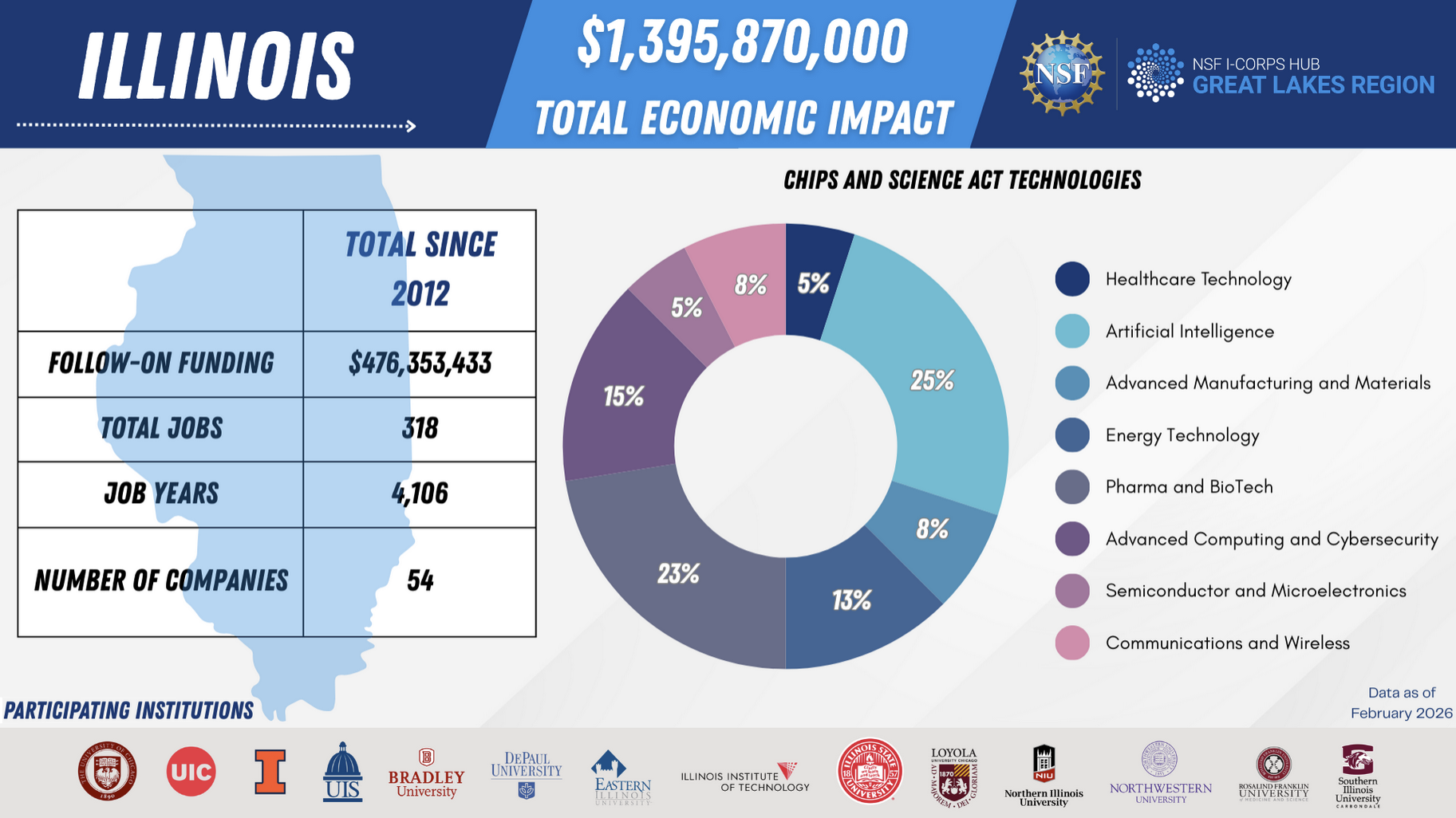 Illinois is emerging as a flourishing hub for university driven entrepreneurship. Illinois companies and startups fueled by the I-Corps program have generated a stunning $1,395,870,000 in total economic impact, according to data as of February 2026. I-Corps trained companies have secured over $475,000,000 in follow-on funding, resulting in the creation of 318 jobs and 4,106 job years since 2012.